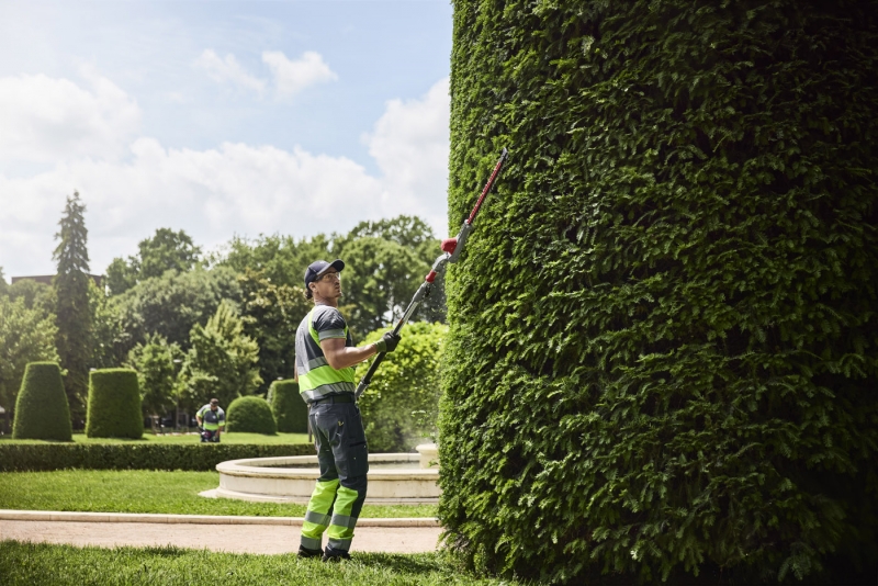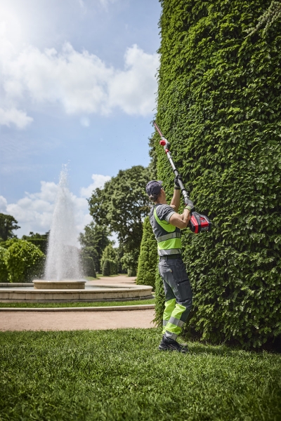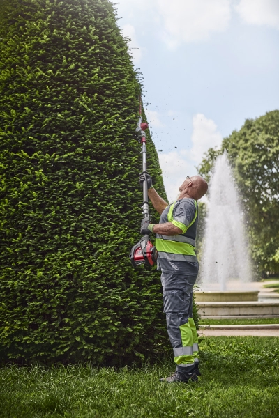 - Pro větší dosah slouží integrovaný zadní nárazník jako přídavná rukojeť při stříhání nejvyšších živých plotů