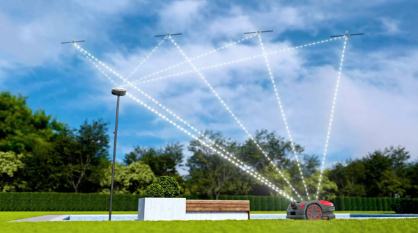 Referenční anténa přijímá satelitní signály a odesílá korekční data do sekačky, aby bylo dosaženo umístění s přesností na cm. Data jsou přenášena z referenční antény do sekačky prostřednictvím signálu LoRa (Long Range).