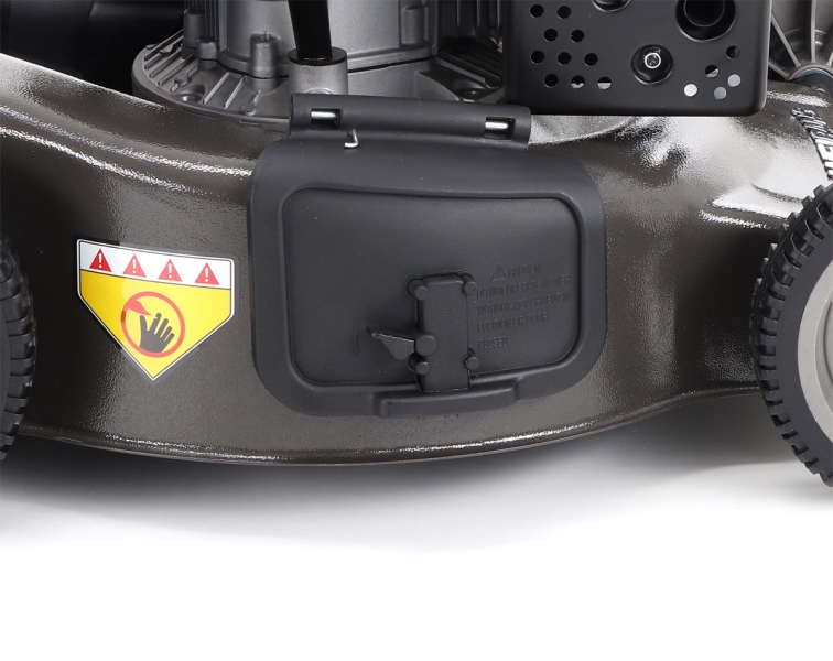 V extrémních podmínkách je možné otevřít kryt na straně šasi a nasadit deflektor bočního výhozu. Je to obzvláště efektivní, pokud máte vysokou, mokrou trávu. Výšku střihu trávníku můžete pohodlně zvolit pomocí samostatné páky centrálního nastavení výšky.