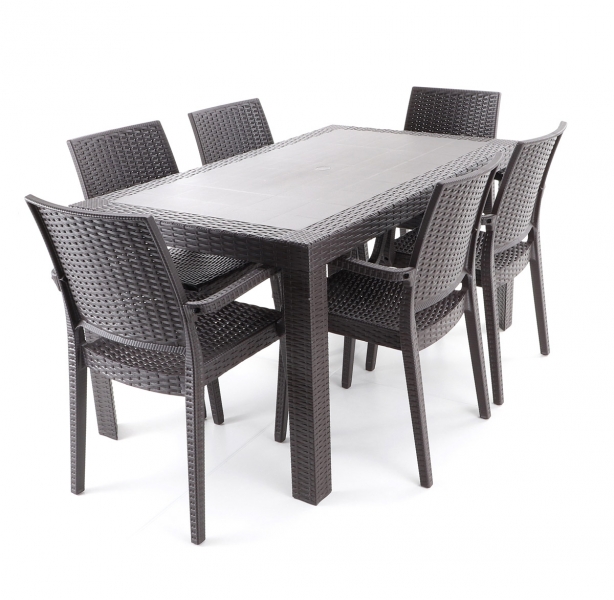 Stolová sestava se skládá z 6-ti pohodlných masivně vyztužených křesel v imitaci umělého ratanu s UV filtrem.